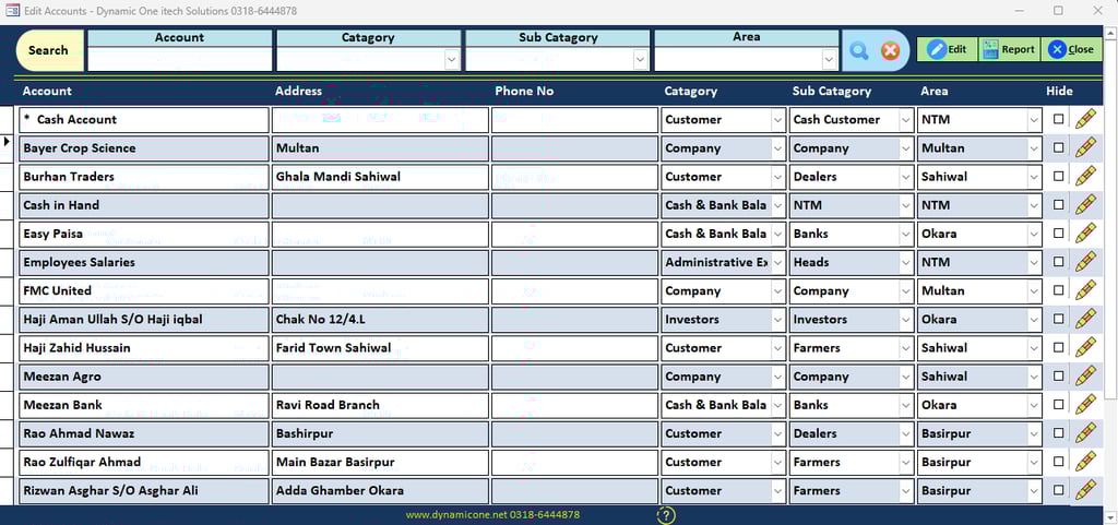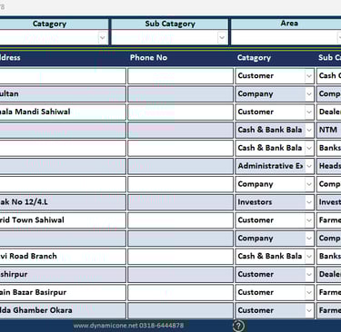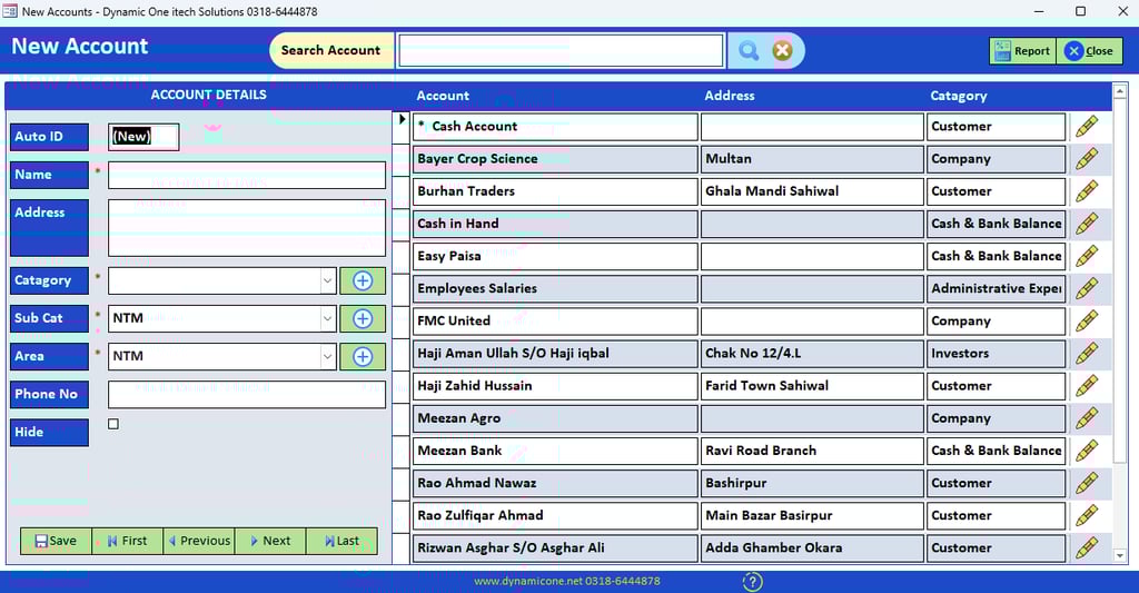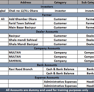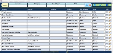 Before adding accounts to the software, it is recommended to first prepare a manual list of all accounts as shown in the picture. This practice helps avoid mistakes and prevents duplicate entries.Add all accounts such as Farmers, Dealers, Companies, Banks, Employees, and Expense accounts in this section. Please ensure that the correct category and sub-category are selected to maintain proper account organization.